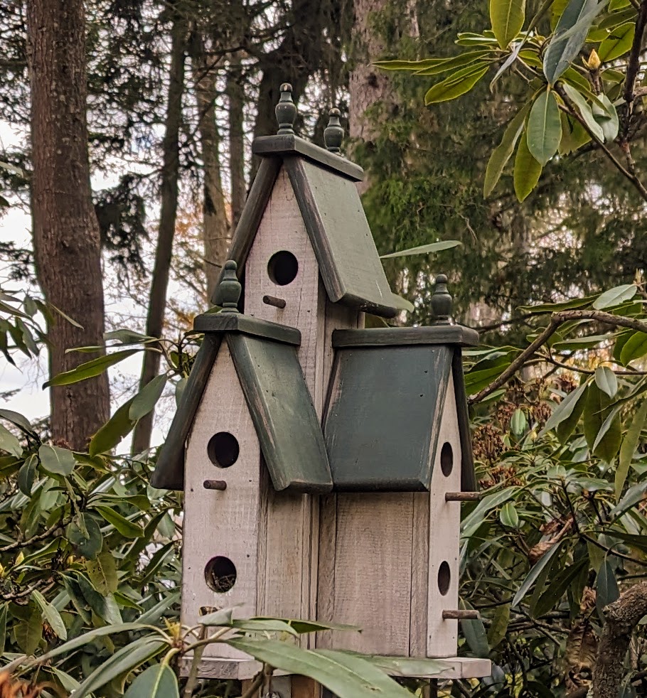 Took the wren house in for the winter on this blustery fall day. Wintering this large bird house has been a late-autumn ritual of mine for several years now and involves unscrewing it from its post, pulling out old nesting material and the occasional spider, and vacuuming the cavities until it’s dry and clean for next year. A bird is much more likely to nest in a dry clear space, and I quite like the sound of the house wrens that come and stay in my Rhododendrons. Last year, a field mouse jumped out of one of the compartments after I’d transported the house to my basement and nearly finished cleaning it. He was likely thinking he’d found an ideal home to spend the winter, but it wasn’t to be.